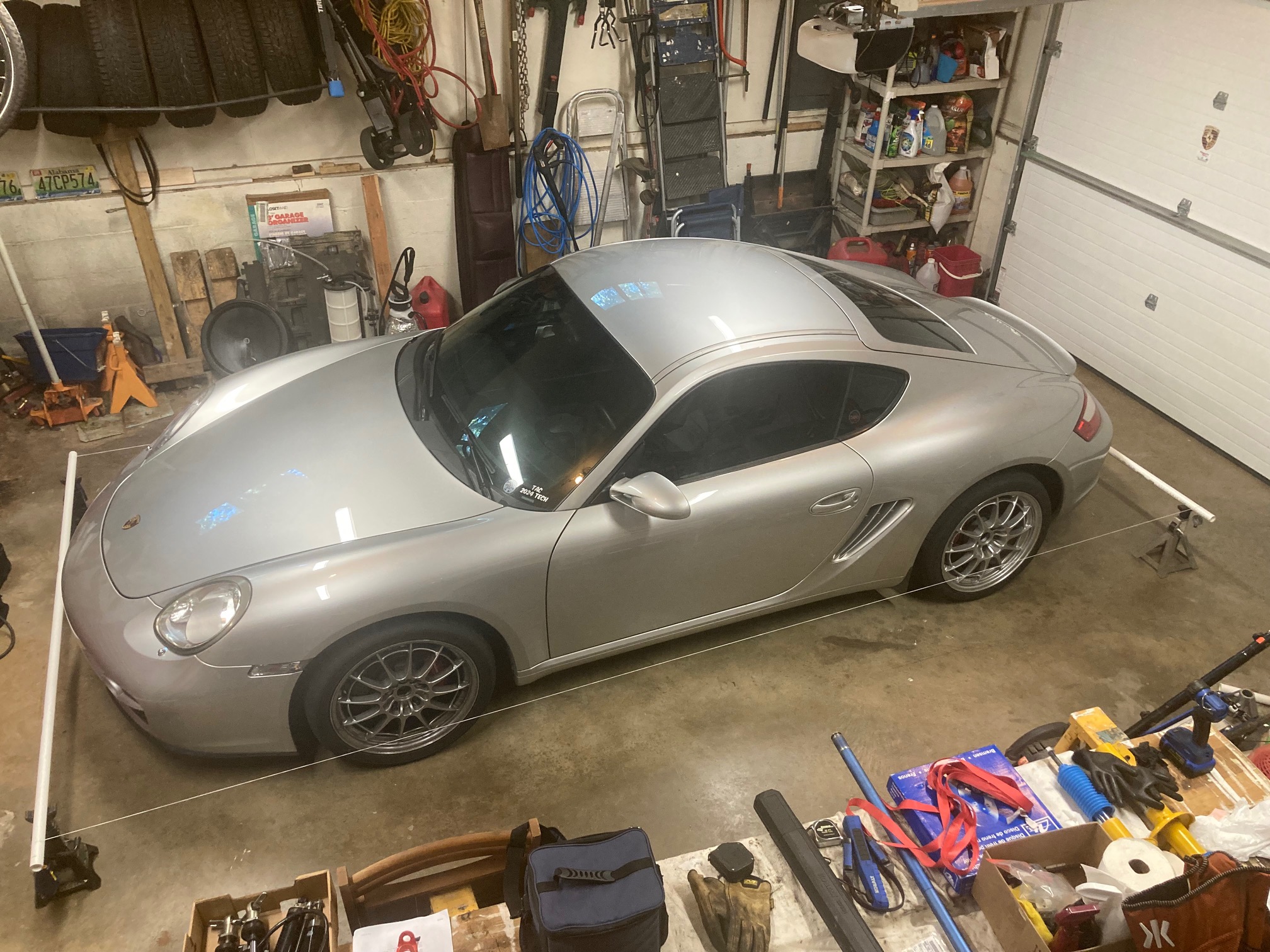 It took only a single iteration on the strings to get what I wanted. The car is now at zero front toe while straight on the axis, and 7/32nds (measured across 19.5″) total toe-in in the rear, split equally to each side and straight on the axis. (7/32nds = 0.32 degrees per wheel) I know that this is more toe-in than most people use for these mid-engined Porsches. It may get reduced later. But, I like to be very aggressive on trail-braking into corners so rear stability when the rear gets light is needed, as least for my confidence. I’ve driven other Caymans with minimal toe-in and they did not give me the confidence I needed when braking hard while turning.