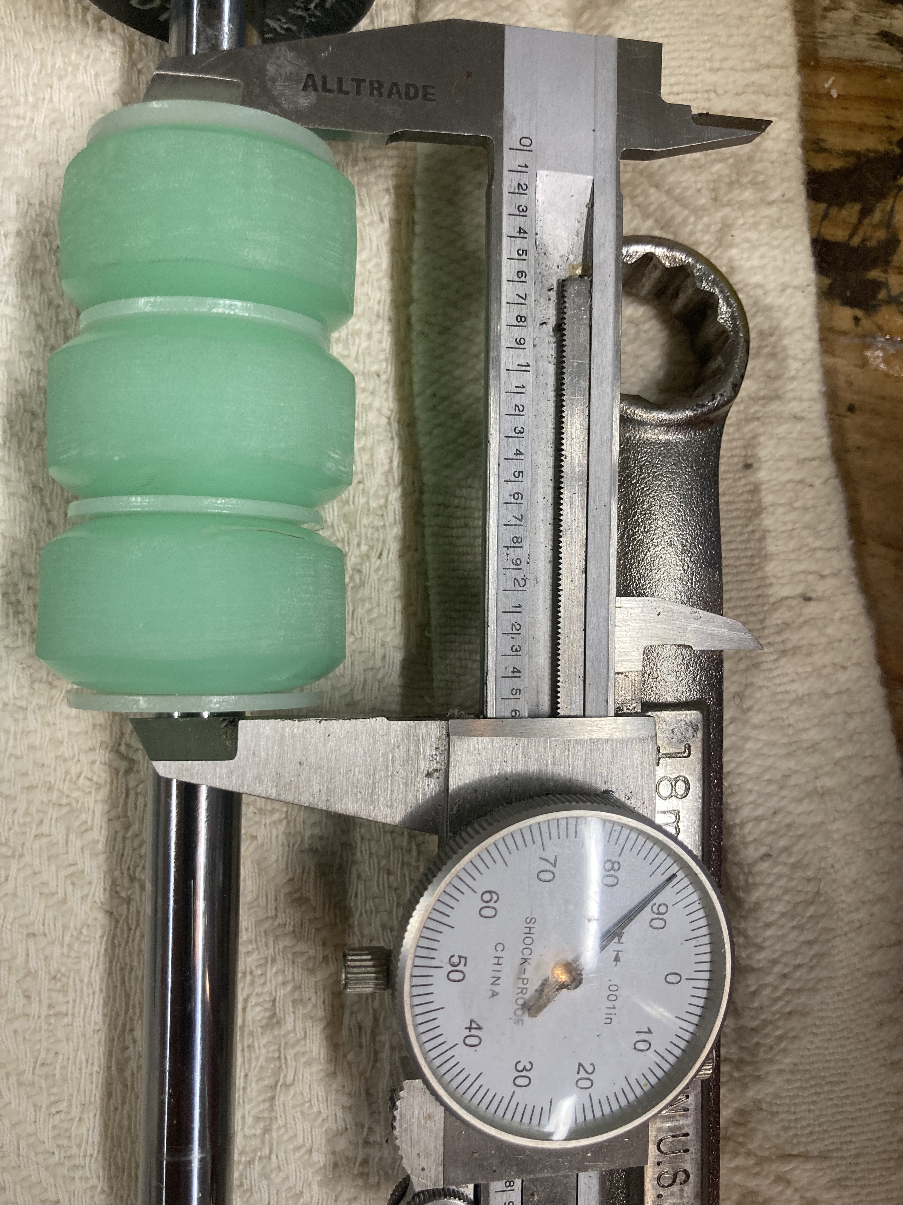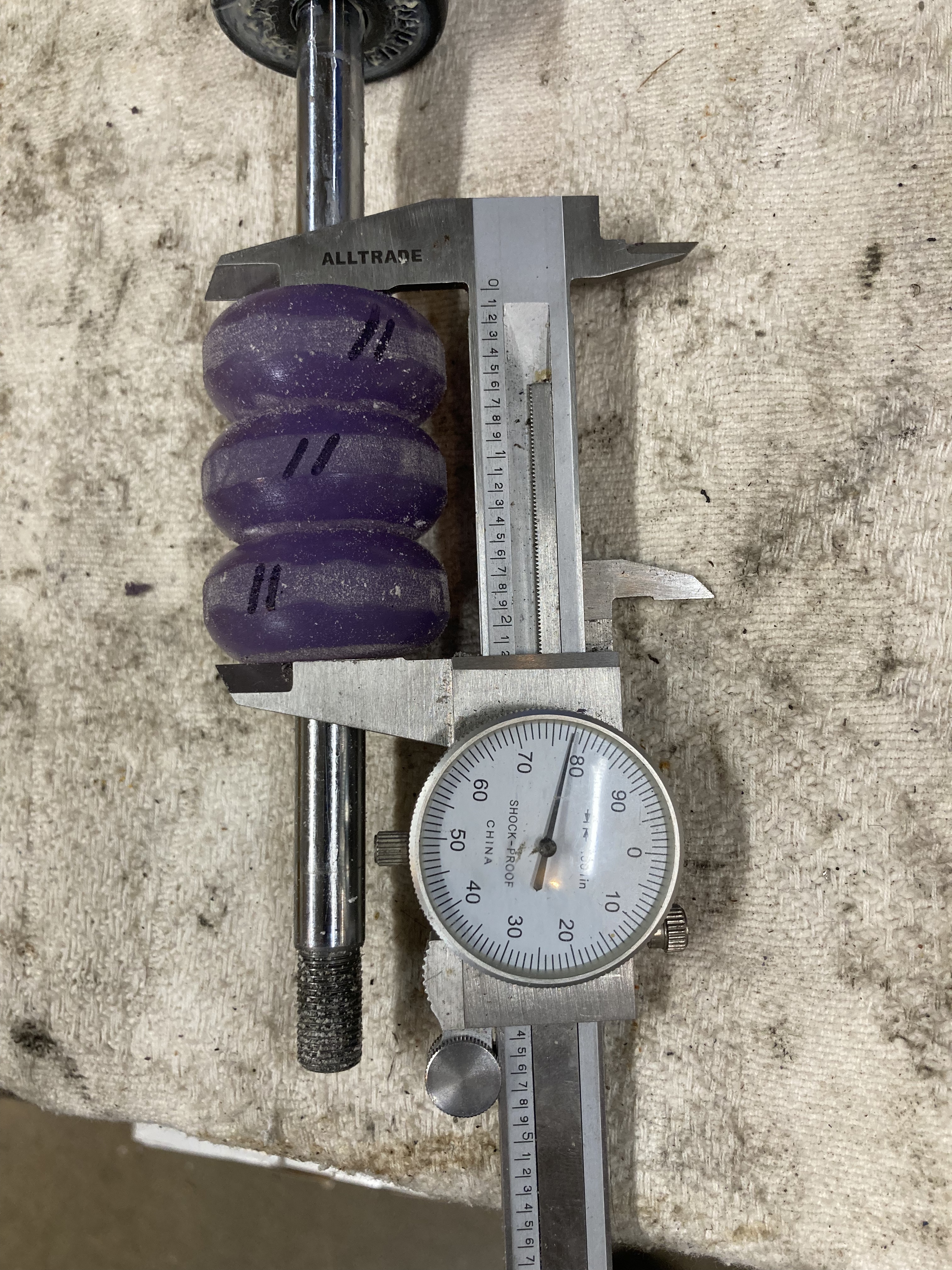 The rear stack is shown above. Notice that material has been removed from the OD making the surface flat instead of oval. I removed 10% of the mass in an attempt to reduce the rate by 10%. Plastic spacers were used to get the total height up to the maximum allowed. I want contact to occur as early as legally possible because I’m trying to limit roll to reduce loss of negative camber.