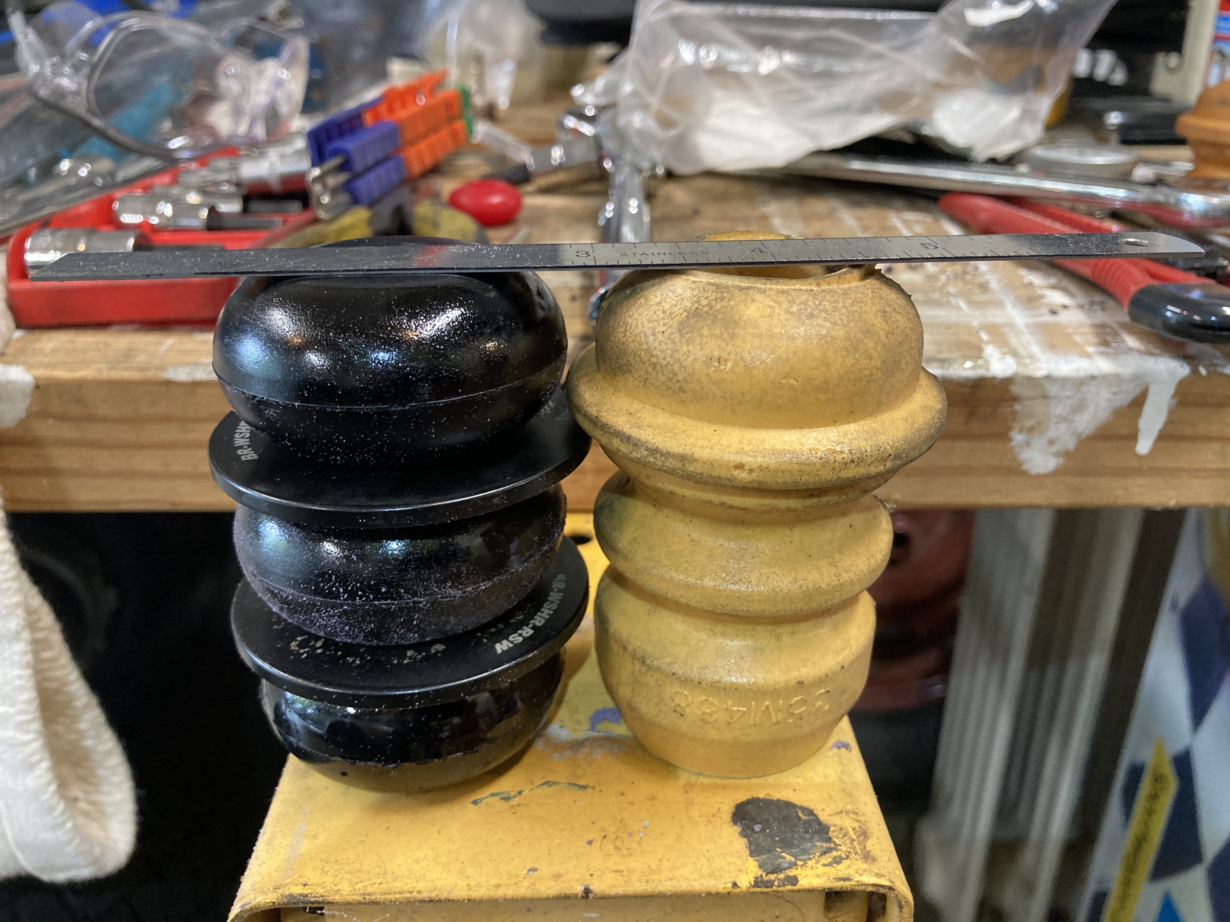Below is what the front bumpstop stack looked like. With the spacers and some slight trimming the stack is exactly the same height as the stock bumpstop. I estimate the stock bumpstop at 75lb/in. The stack of three blacks provide 350lb/in.