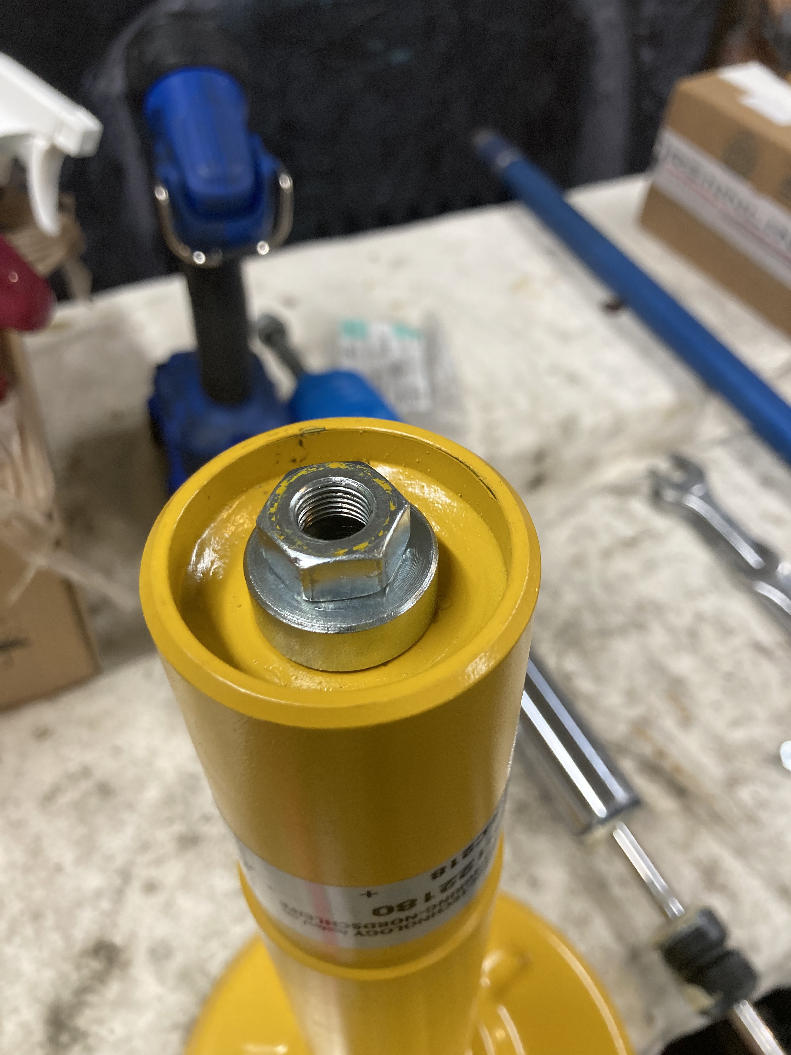 The solution was to drill out the threads in the bottom of the housing where the shaft attaches and weld on a spacer and a new nut. This pulls the shaft attachment point down to reduce the extended length. The effect is to reduce the increased droop travel that the B6 has over the stock B4 strut. Prior to welding it looked as below.