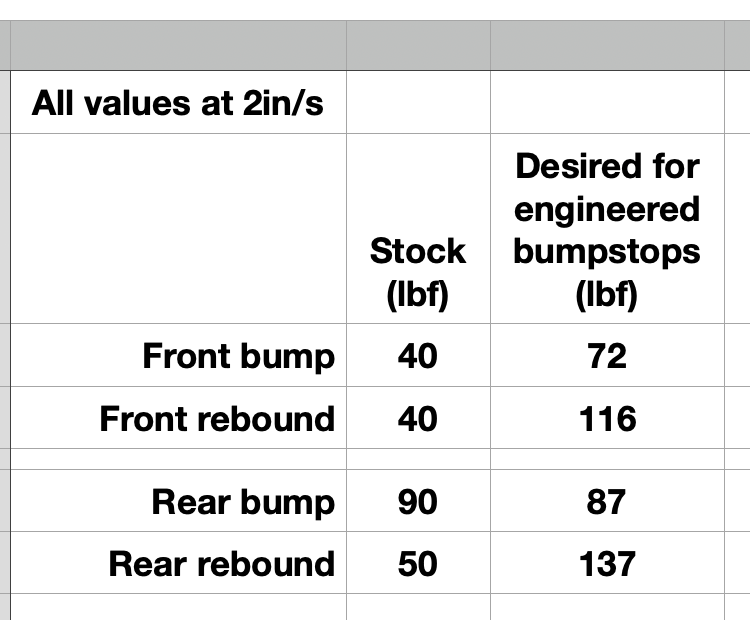 Below is a comparison of forces provided by the stock struts at 2in/s shaft velocity to what I think is needed. Except for rear bump the stock values are insufficient to control the sprung mass. This is to be expected since the bumpstops massively increase the effective spring rate. By the way, the “desired” values take into account the resilience of the polyurethane when calculating rebound forces, that is, the fact that the bumpstops have significant internal damping and return at most 65% of the applied energy. If I didn’t take this into account I would end up with too much rebound force once I install revalved B6 struts.