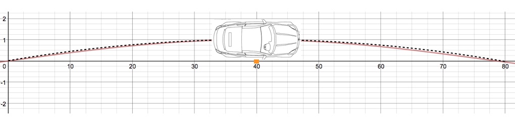 Now I’d like to assume a different, very simple, path model for a car transiting a slalom. Not because it’s necessarily more accurate than the sine curve but because it will be useful.