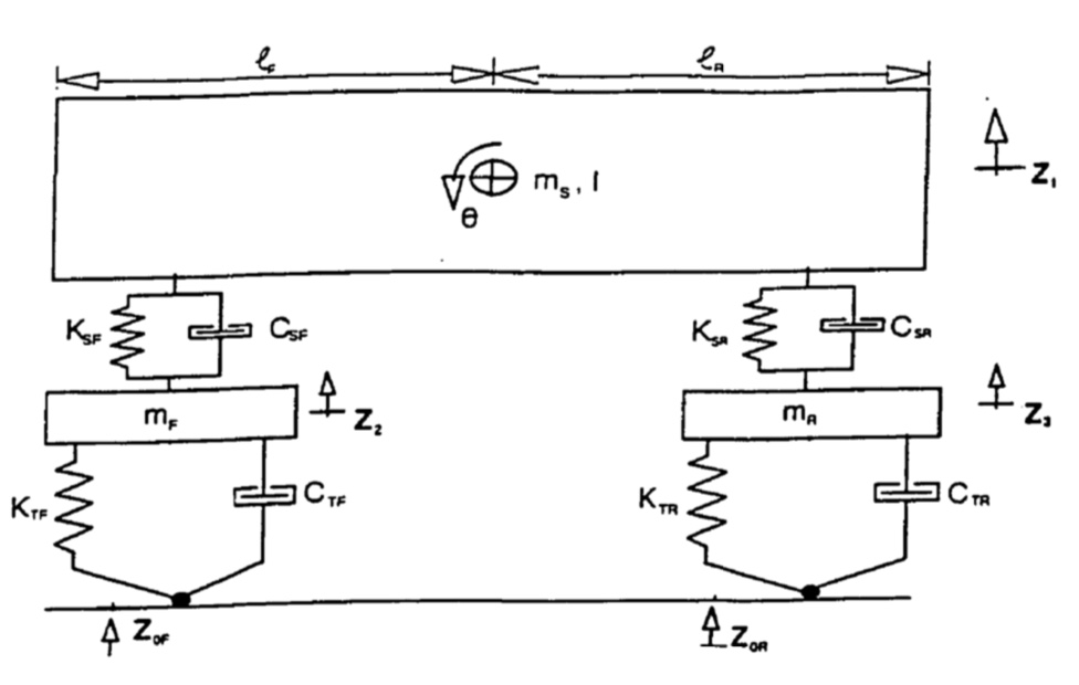 Starting from the top, the big rectangle represents the sprung mass of the vehicle and how it can translate vertically and rotate in pitch. Ksf is the main suspension coil spring (either just one or both fronts together) where K stands for the spring rate. Csf is the shock absorber parallel with the coil spring where C stands for the damping rate. The Mf is the unsprung mass of the front tires, wheels, axles, etc. Ktf and Ctf are the spring rate and damping rate of the front tires. Ctf is very small and is almost universally ignored, but not by Muluka. This guy kept it in his math, at least as far as I can tell by inspection of the equations he develops that represent the model. The Z’s at the bottom are the input displacements from the roads, i.e. bumps and holes. He uses mathematical forcing functions for the Zs that represent smooth, moderate and rough roads, specifically the roads in his area of Canada. Someone else had already collected that data.