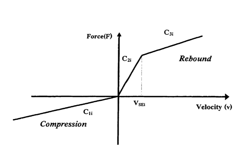 Muluka then creates shock absorber models that are more sophisticated than most studies I’ve read. When he looked at typical truck shocks he found that they were 1) asymmetric, i.e. had different values for compression and rebound, and 2) had blowoff valves on the rebound side. Such shocks have characteristic curves as shown below in Figure 2 (his Figure 2.13).