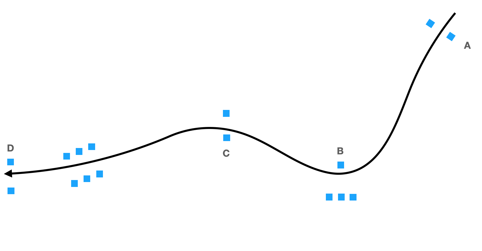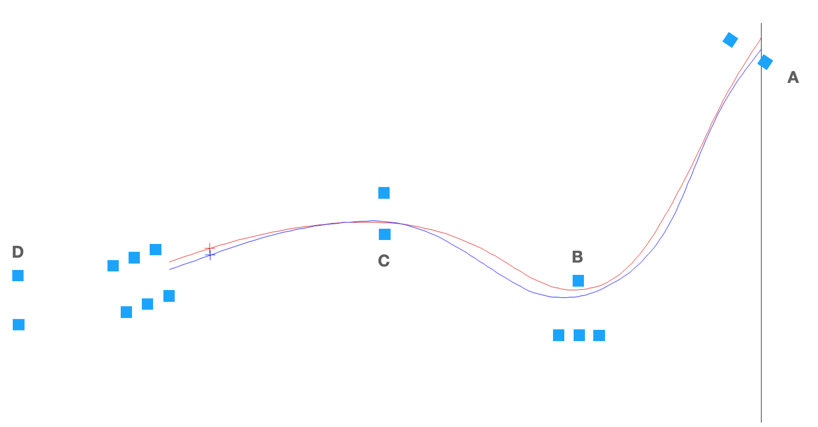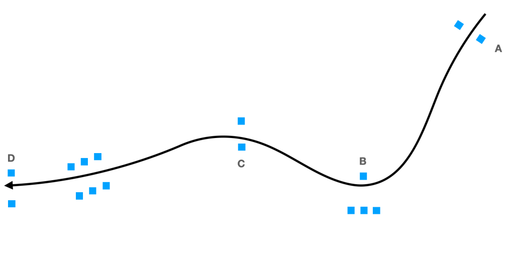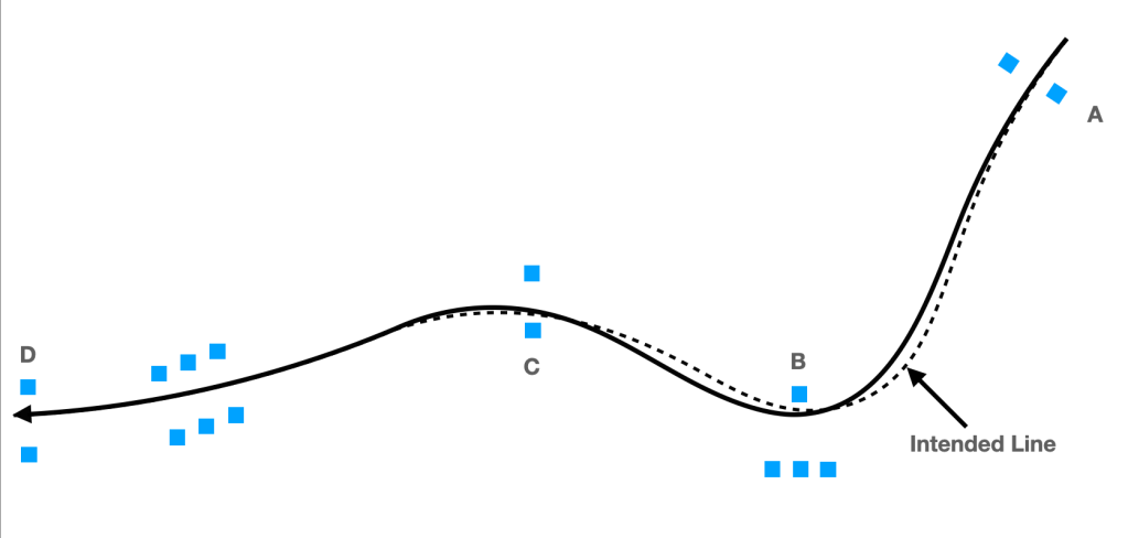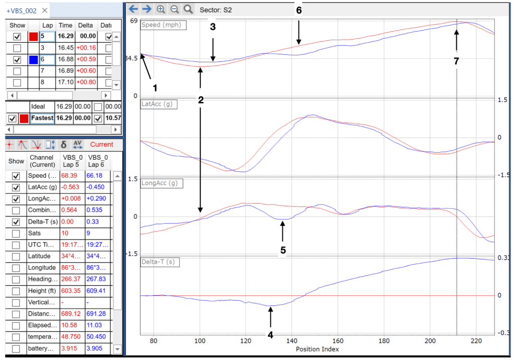 To review, I decided it best to move the “standard” line on the approach to B, as shown in Figure 1, to the right in order to not be required to lift on the approach to C. This allowed me to maximally accelerate coming out of B all the way to D. I decided it was better to give up some time early to gain more later. Compared to my run when I didn’t do this and compared to all my co-drivers’ runs who never did this I Saved Time.