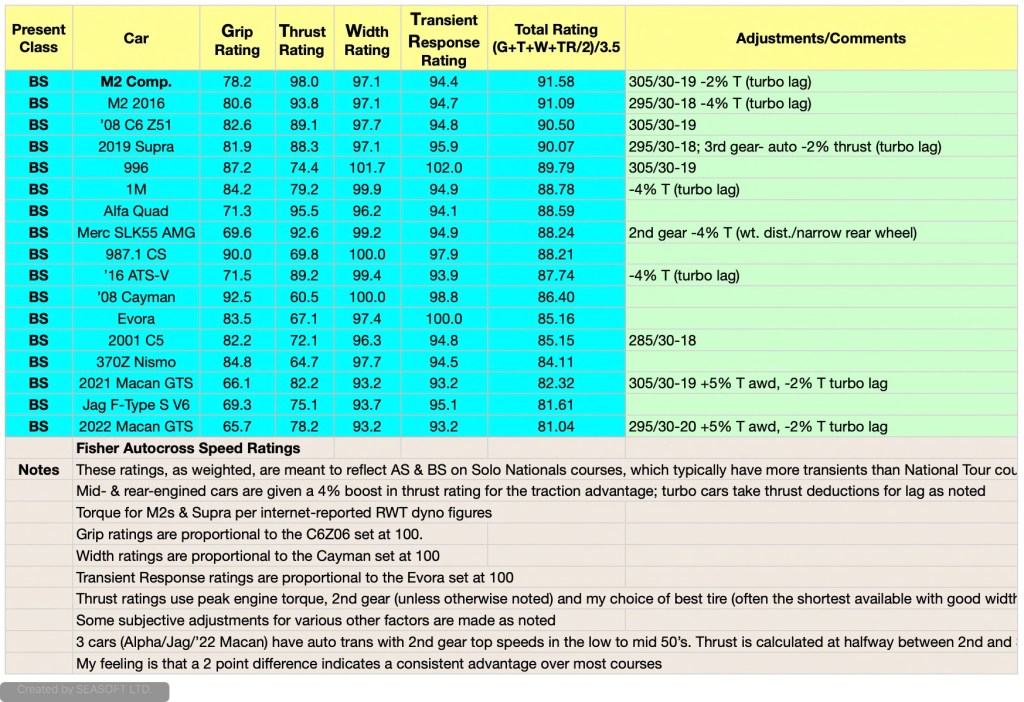 Some may know that I’ve been compiling a rating system for autocross cars for several years. It’s aimed primarily at A-Street and B-Street. Below is the list of BS cars for which I’ve run the numbers.