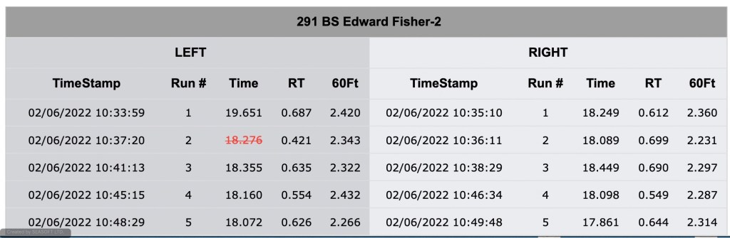 In the picture above you have, from left to right on the top row, the clock time of the first run which happened to be from the left side, its sequential number in that session and that side, the total time of the run, the Reaction Time, and the time to travel the first 60 feet. Then you have the same data again for the first run on the right side. For those not familiar, the quickest left side time is added to the quickest right side for your total at a competitive event.