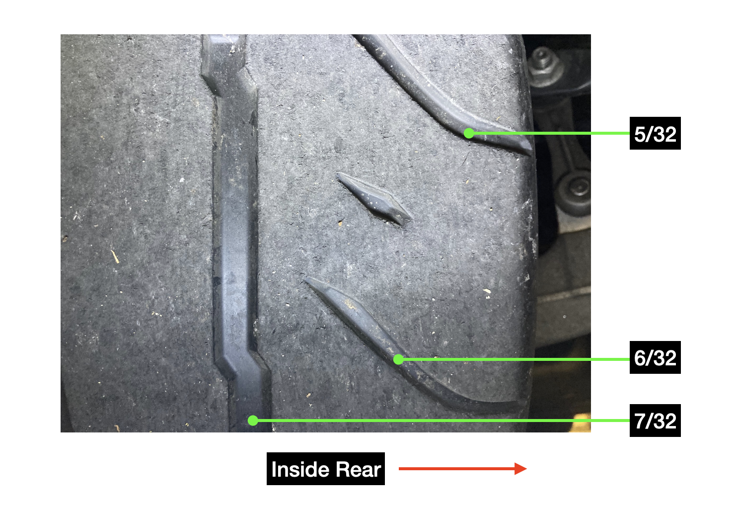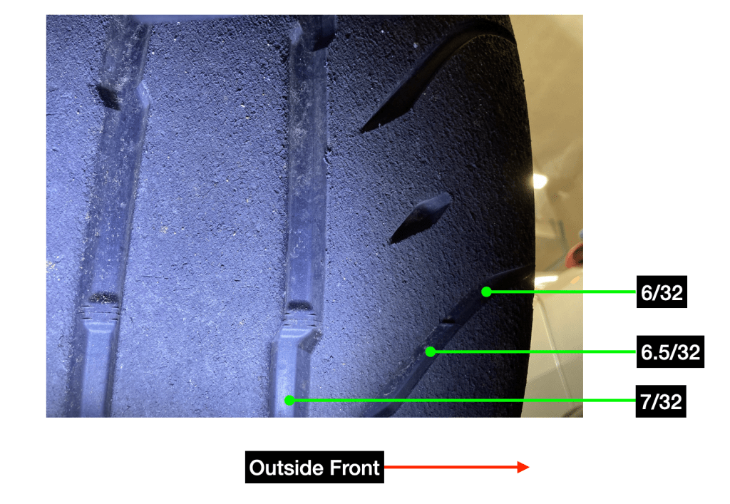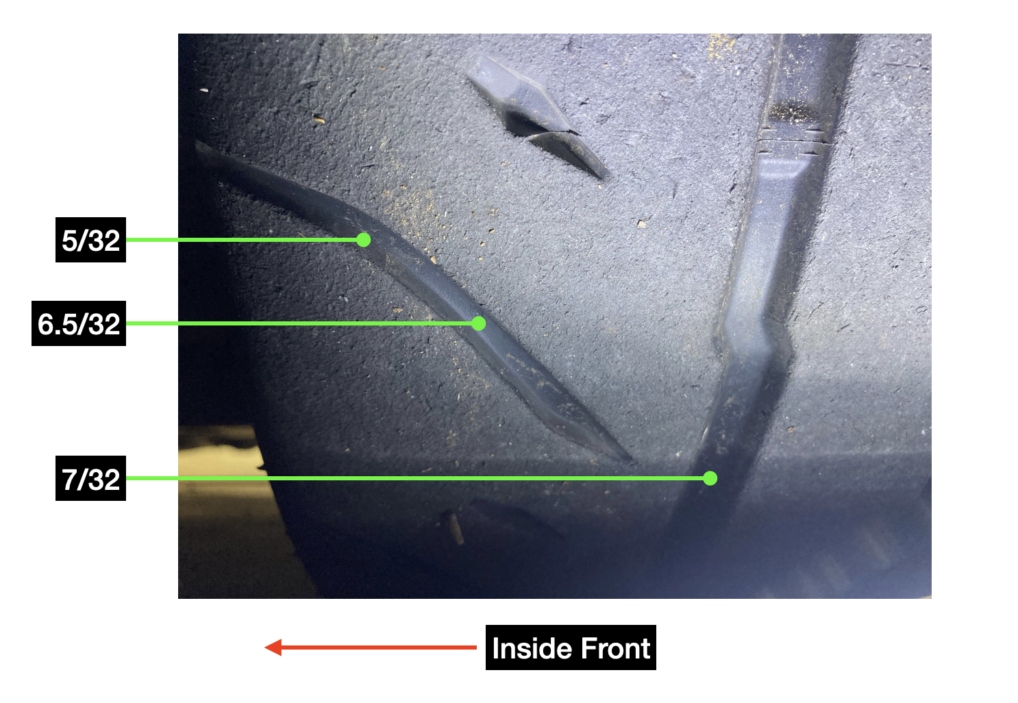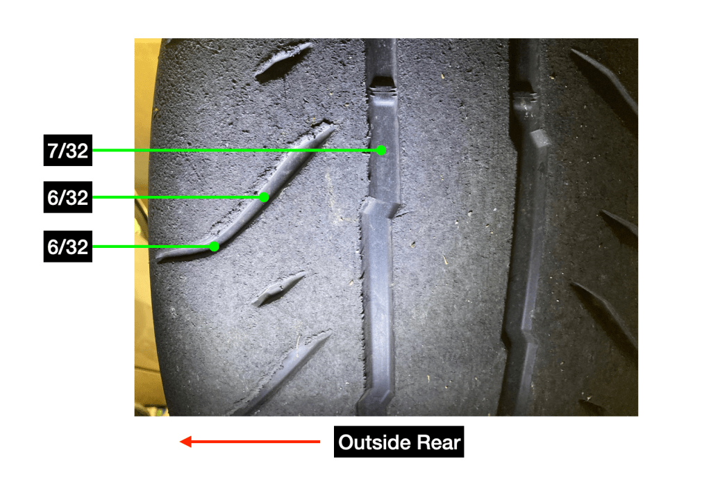 The Falken 660 tires I’m running have a nominal as-molded tread depth of 8/32 inch. After the Moultrie Pro-Solo test event, where I got 60+ short runs and another 40 or so practice starts, both front and rear tires had lost 1/32″ in the center, 2/32″ on the outer edges and 3/32″ on the inner edges. This seems to me a reasonable wear rate on concrete. I was pleased that front and rear were very similar. The rear probably would have been worse except that those 40 extra practice starts were done in either wet or damp conditions which limited the wear rate even though I was having trouble controlling wheel-spin. Below are annotated pictures. Let me know what you think about the wear.