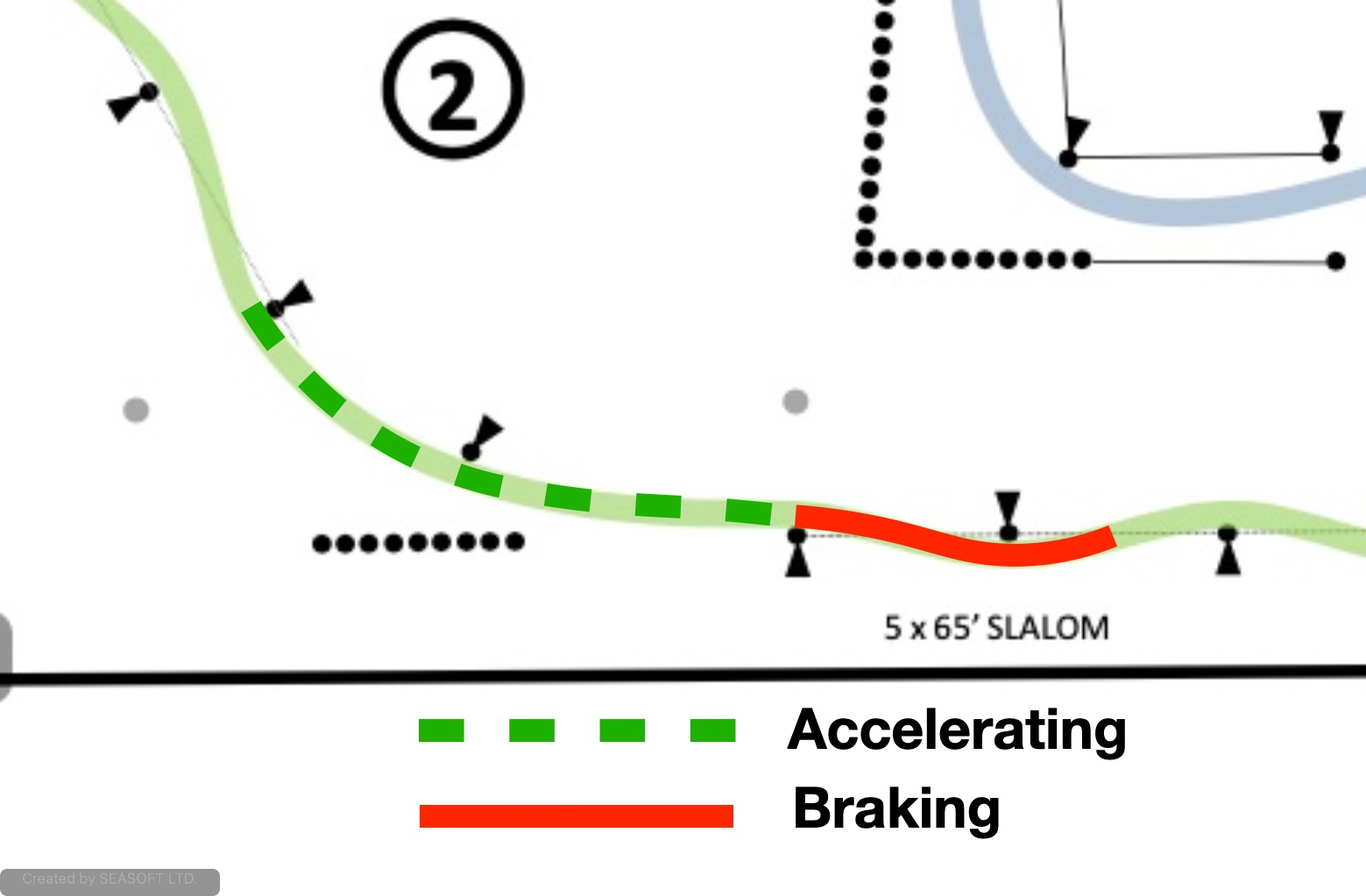After an initial set of runs my co-driver and I agreed that we had a problem. The 5-cone slalom was entered by by-passing the first cone and considering the entrance to be from the hard side of the second cone, meaning you had to brake hard down from toooo-fast and then turn in all the way around that second cone. (See the closeup of this section in the figure below.) In the figure the dashed green path is an area of full acceleration. The first cone of the slalom served only to pinch the entry, preventing getting much of any angle on the second cone. Right about there we had to threshold brake and immediately turn around the second cone, still decelerating.