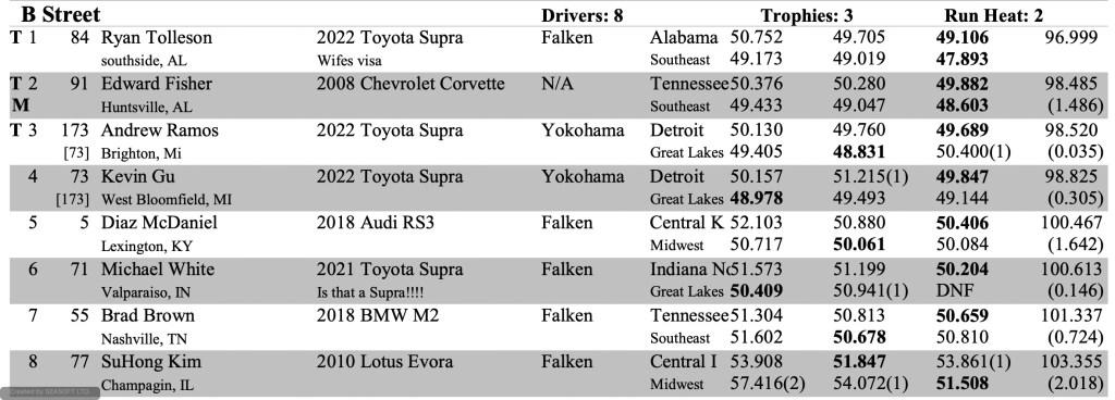 During the lunch break I adjusted the shocks to the new 90%critical settings. I got a little push from the front tires and little more bounciness over the bumps. In the end my co-driver and I decided we liked the 83% setting on the front with the 90% setting on the rear, along with some tire pressure changes that we also tested today. That’s what we’ll use at Bristol, which is a bumpy asphalt site like our local site.