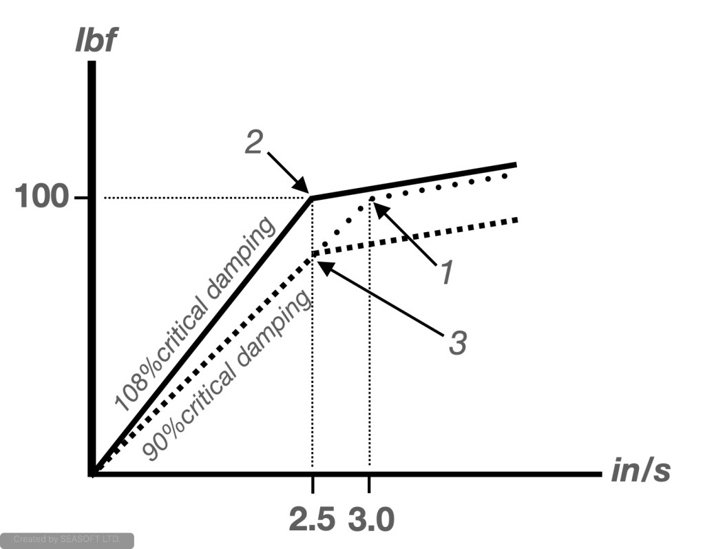 But, when I wrote the spec, I changed that point to be at 2.5in/s, that’s point 2, and I forgot to recalculate the force for 2.5in/s. So, Penske gave me point 2, which is 100lbf at 2.5 in/s. See how the line from zero to point 2 has a steeper slope? Every point on that line turned out to represent about 108%critical damping.