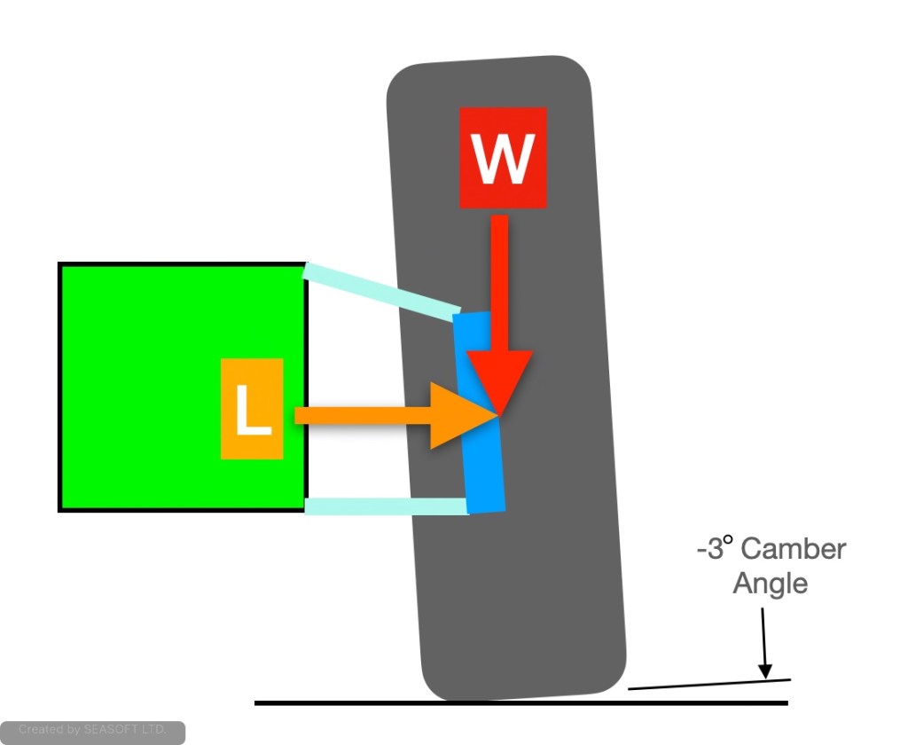 In the diagram we have two forces shown acting on the tire: W stands for weight and L stands for lateral load. Just for fun and so you can develop an eye for it, the wheel in the diagram is actually tilted at 3.6 degrees of negative camber. (I meant it to be 3 degrees, but something happened.)