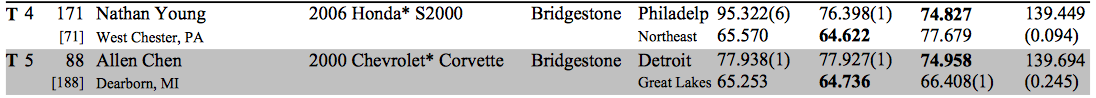 Man, was I drained. Top six were Corvette, S2000, Corvette, S2000, Corvette, Solstice, with the top five separated by a total of 1.001 seconds over two days.